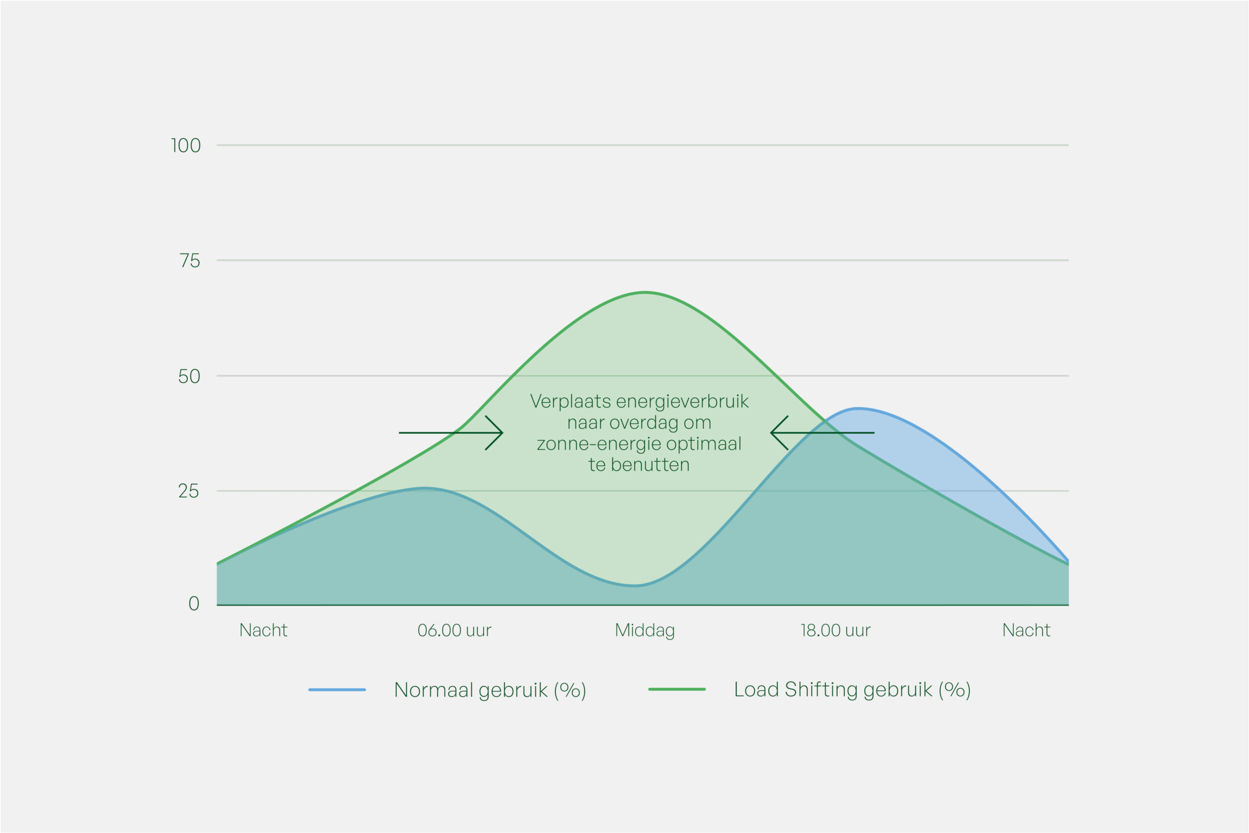 Load shifting draait om het verschuiven van energie-intensieve processen naar momenten waarop de energiekosten lager zijn of het net minder belast wordt. Hierdoor vermijd je piekuren en maak je gebruik van voordelige daluren. Dit is interessant doordat je tijdens de daluren een lagere prijs per kWh betaald. Daarnaast verminder je de druk op het energienet en zorg je dat je je eigen opgewekte energie direct goed kan inzetten.