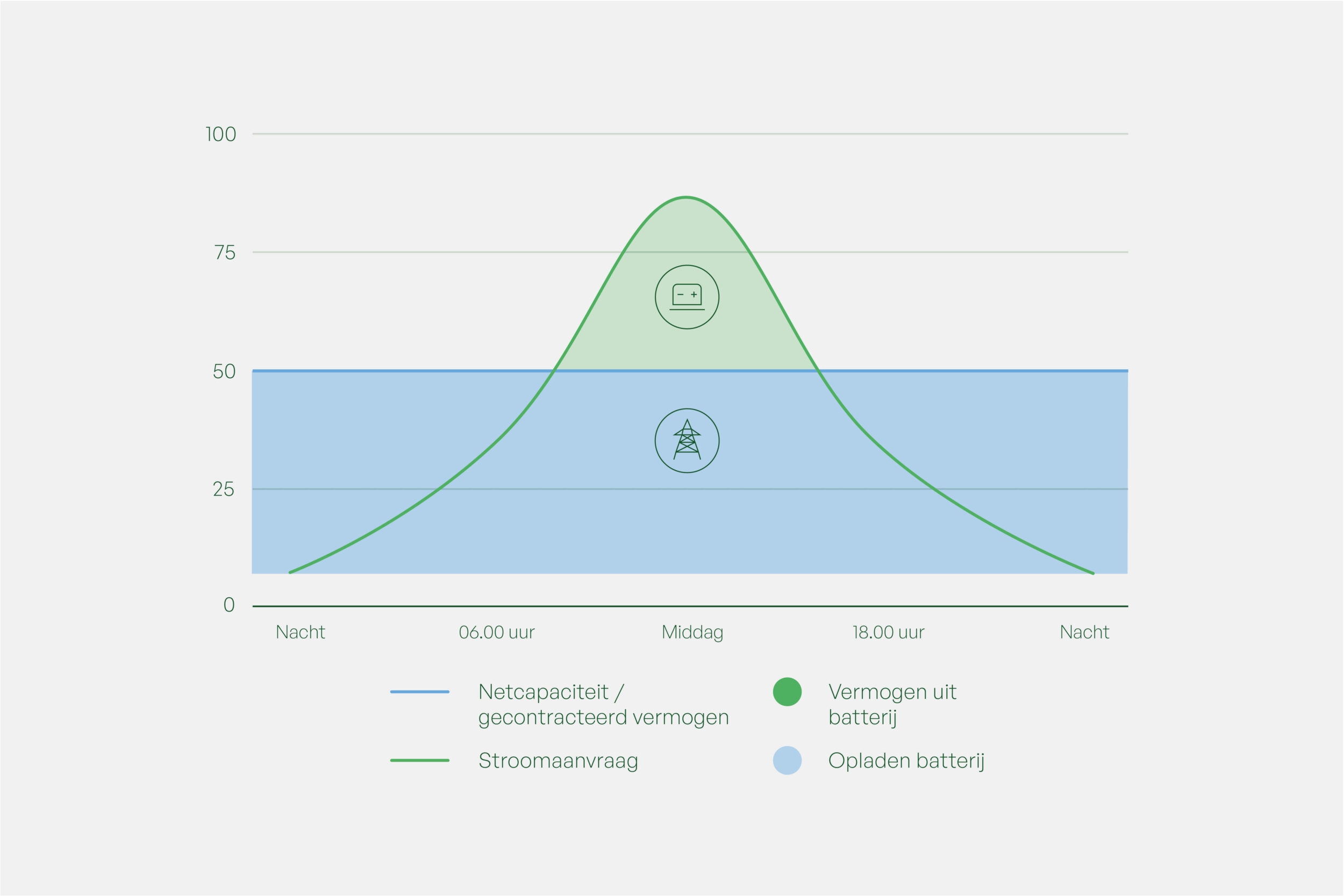 Peak shaving: vermindert en vangt de pieken in het energieverbruik door gebruik te maken van opgeslagen energie.